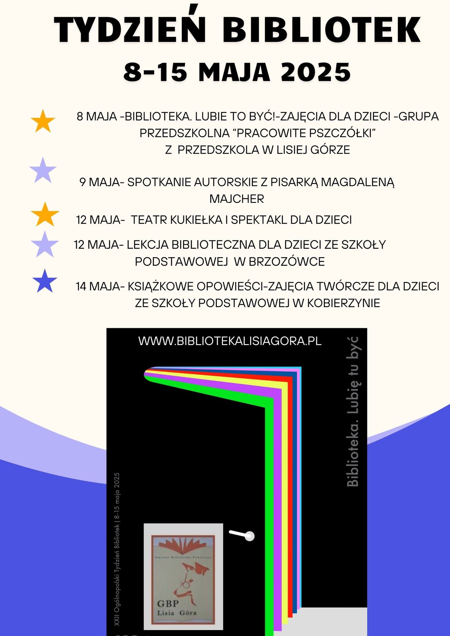 Tydzień Bibliotek to ważne wydarzenie, które przypomina o roli bibliotek w naszym społeczeństwie. Jest to ogólnopolska akcja, która corocznie odbywa się w dniach 8-15 maja. Ma na celu promowanie czytelnictwa i bibliotek. Na plakacie poniżej przedstawiamy niektóre propozycje Biblioteki w Lisiej Górze i zapraszamy do udziału w wydarzeniach.